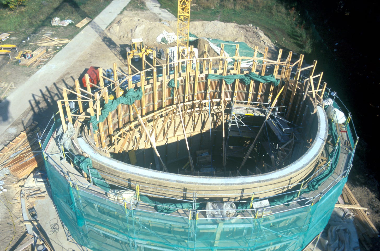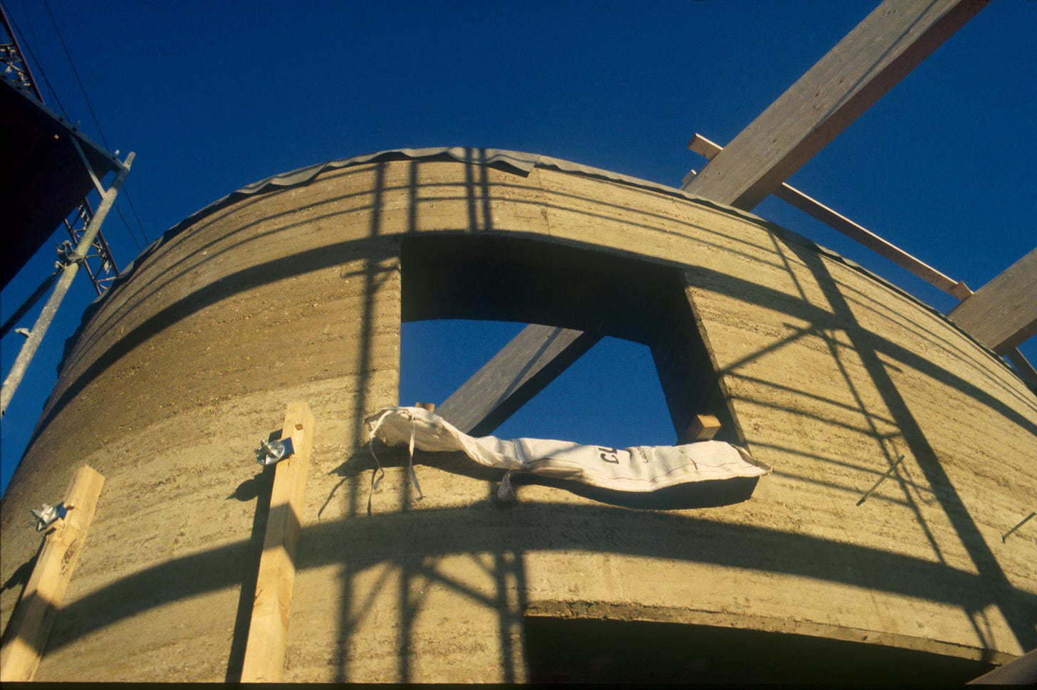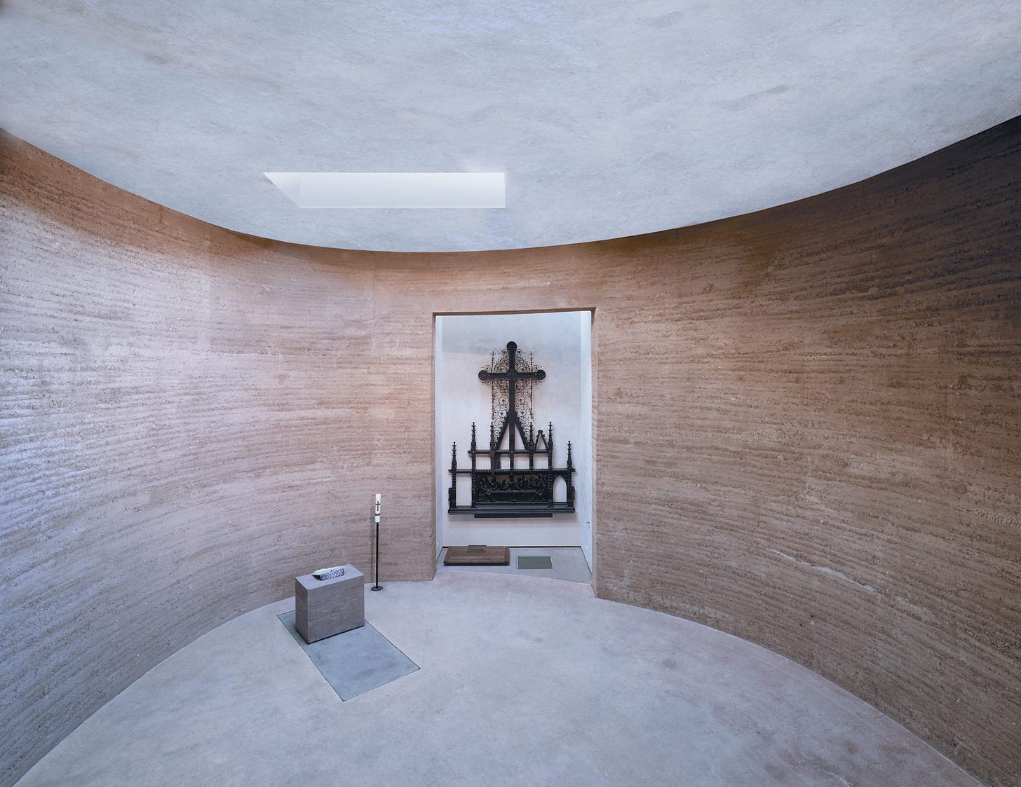 The materiality of the building performs the reconciliation it signifies. The chapel's inner oval is constructed using rammed earth, a technique that had not been used for a public building in Germany for over 150 years (Raunch, 2001). The builders compressed 30 cm of moist clay to 8 cm layers, incorporating stone and glass fragments sourced from the rubble of the demolished 1894 church (Raunch, 2001).